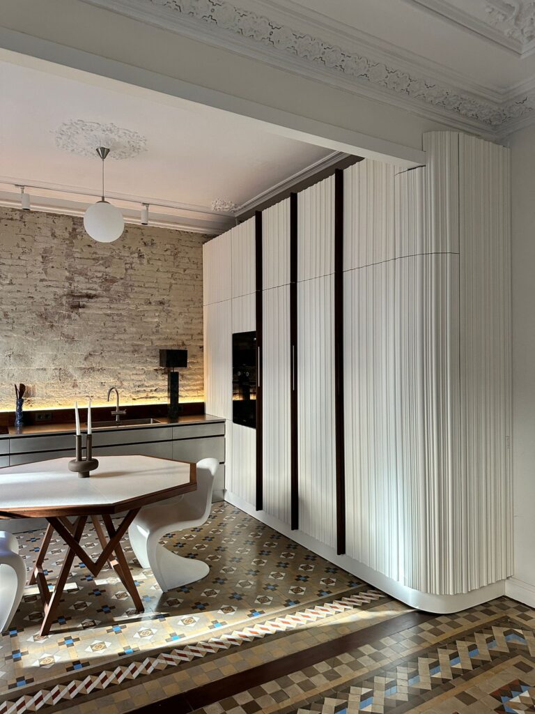 Aprovechando la máxima altura que un piso señorial de principios de siglo XX, una propuesta que dista mucho de una cocina convencional. Solamente dos tiradores de madera, nos dejan adivinar que algo alberga en su interior. En términos de funcionalidad y estética cabe destacar los módulos embellecedores que permiten almacenar y, a la vez, esconder la completa equipación de una cocina premium.